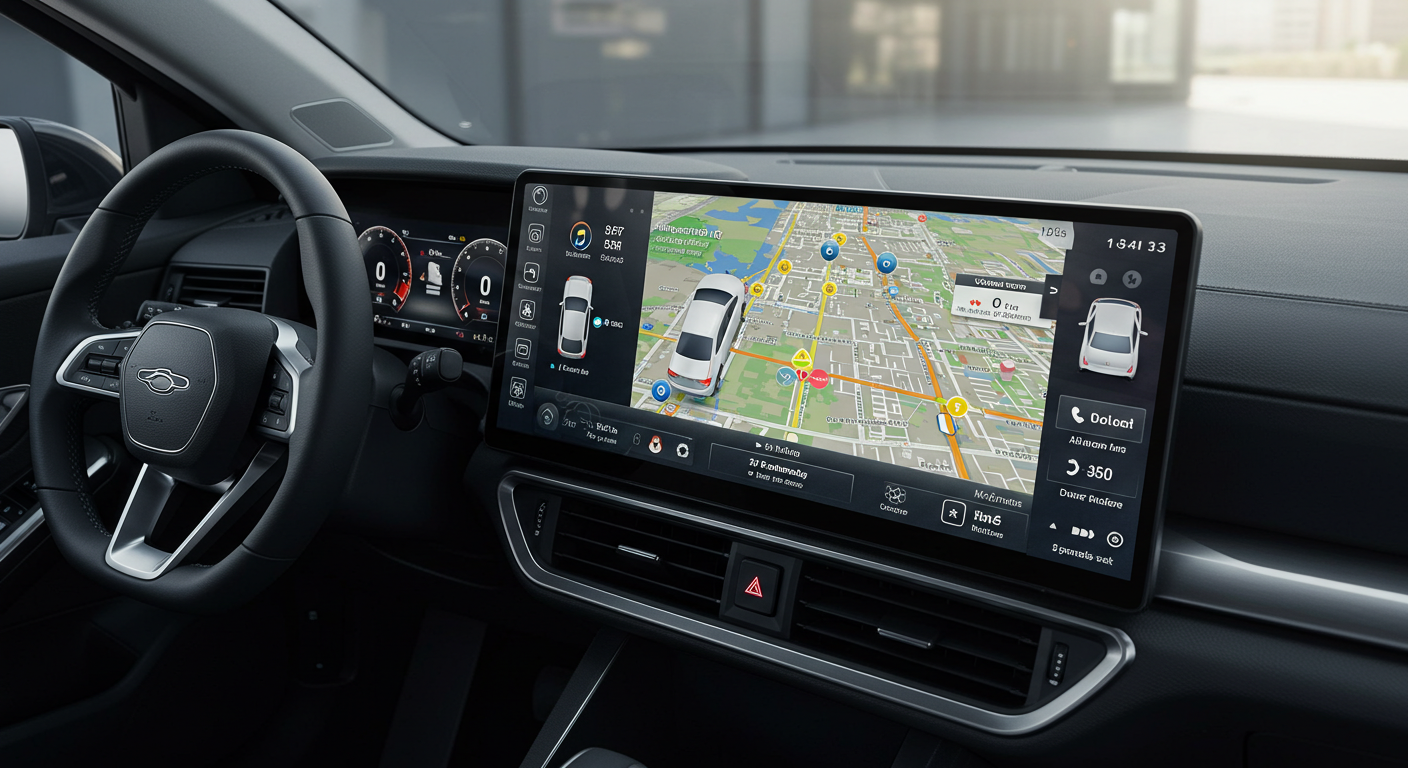 Interfaces dedicadas no veículo são otimizadas para segurança e usabilidade durante a condução.
